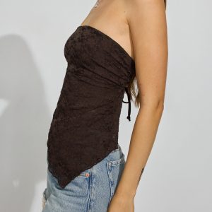 Asymmetric Tube Top Brown women – Having a tube top and denim moment and loving it. Features Embroidered floral pattern throughout Semi-sheer midriff Lined bust Self-tie strap at open back Size & Fit Fit: Fitted Length: Cropped Model is wearing size S Materials & Care Content: 92% polyester, 8% spandex Care: Machine wash, cold Imported