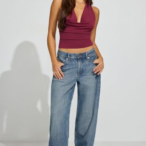 Deep Cowl Neck Halter Top Burgundy women – The way this is hitting different with some jeans ! Features Self-tie halter strap Ruching at sides Open back Double lined Size & Fit Fit: Fitted Length: Cropped Model is wearing a size S Materials & Care Content: 93% recycled polyester, 7% spandex Care: Machine wash, cold Imported