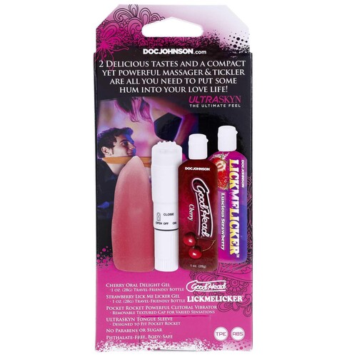 Get & Give Hotter Oral With This Fun-Filled Kit! Cherry-Flavored Gel, Strawberry-Flavored Gel, Vibe & Tongue Sleeve Included.