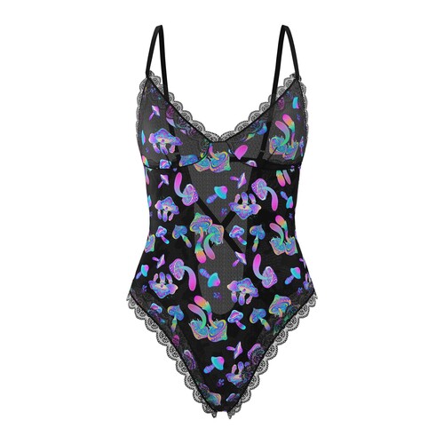 Step into the haze of the blacklight and wow your lover! This trippy mushroom teddy has high rise hips and a cheeky thong cut to show your body off.