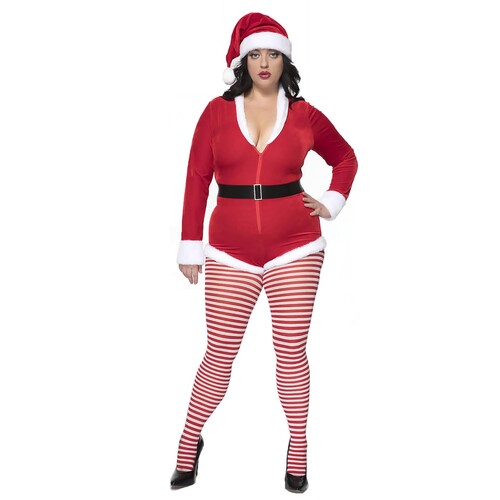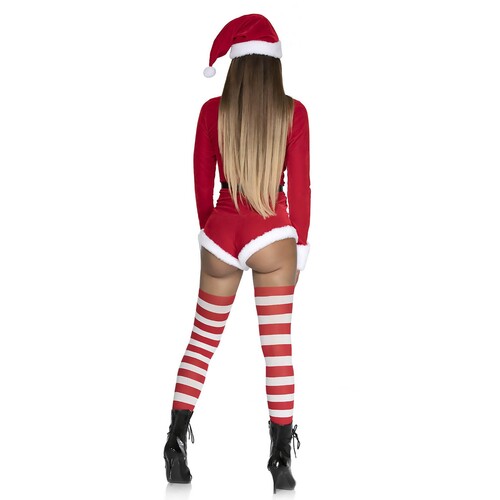 Velvet zip up Santa romper snatches your figure, giving you the ultimate sexy silhouette. Matching hat and faux fur trimming!